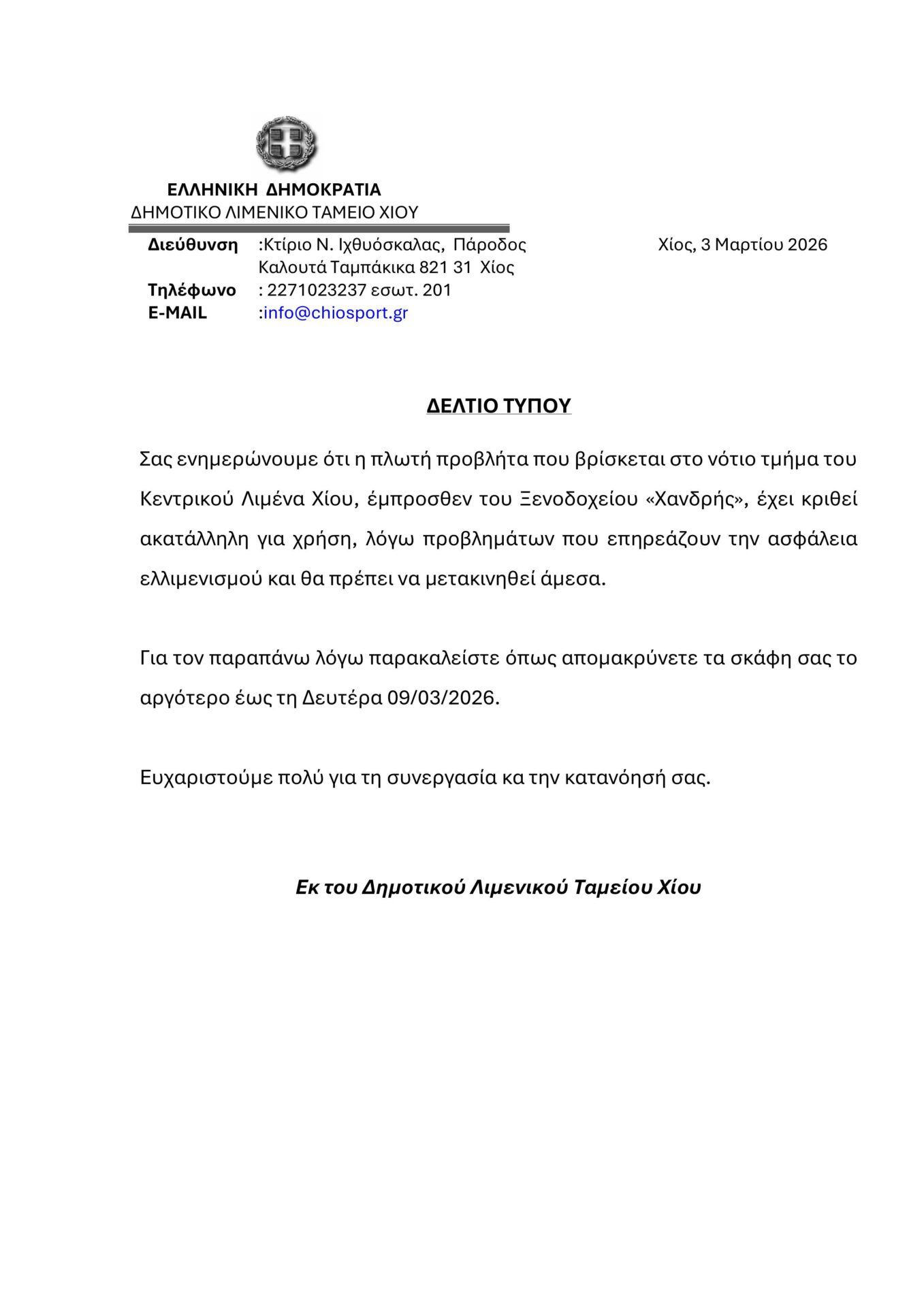 Δελτίο Τύπου για πλωτή εξέδρα κεντρικού λιμένα Χίου